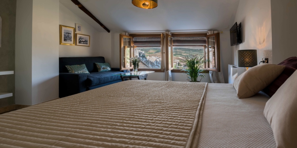 Habitación doble de 25m2 aprox. con cama de matrimonio y sofá cama.